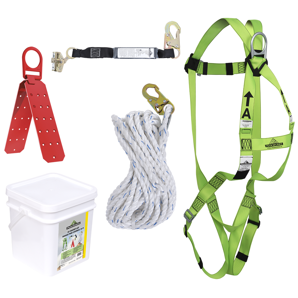 - PeakWorks offers a wide range of pre-packaged fall protection kits that include specific full body harnesses and connectors and, in the case of roofer’s kits, a shock-absorbing panic rope grab and anchor